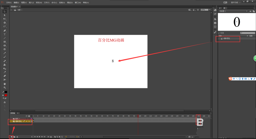 4、單擊返回場景,新建一個圖層,將該圖層命名為“0到9變化”,然后打開flash中庫窗口,將元件“0到9變化”拖入到畫布中,在圖層1和新建圖層時間軸的第155幀位置按F5創建一個空白關鍵幀。這個時候按回車會看到只是0到9的循環變化。