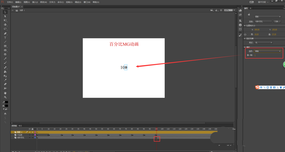 6、做完上一步之后,我們按回車鍵會發現到了100之后,最下方的各位數圖層依然在0到9變化,所以選中“0到9變化”圖層,在該圖層第100幀的位置插入一個關鍵幀,打開屬性窗口,單擊個位數數字,這時候屬性窗口中會出現循環命名,將循環選為“單幀”。