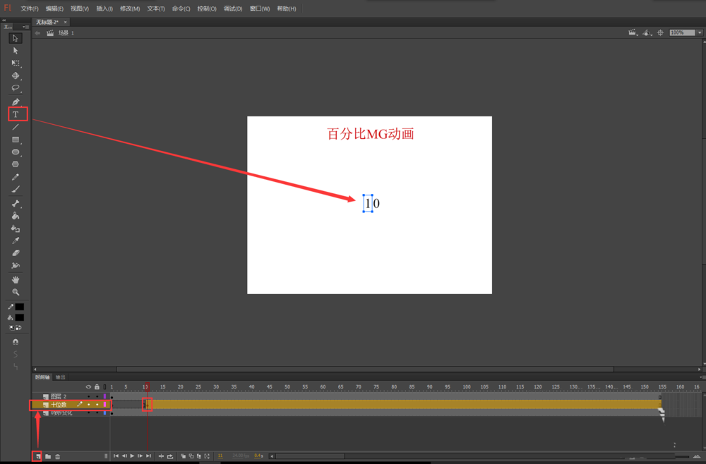 5、在時間軸窗口中在新建一個圖層,命名為“十位數”,然后在第十一幀位置按F6插入一個關鍵幀,用文本工具輸入數字“1”,用選擇工具移動到合適位置;然后以此類推,每隔十個關鍵幀就插入一個關鍵幀,并將文本內容改為2到10.