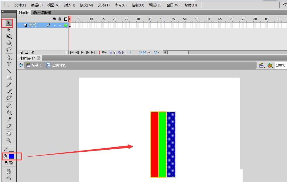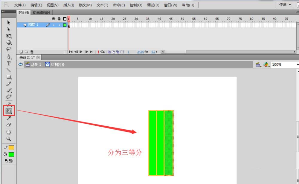 3、雙擊矩形進入繪制對象,用選擇工具框選出矩形的三分之一大小,然后墨水瓶工具單擊封閉,重復操作,將矩形大致分為三等分。