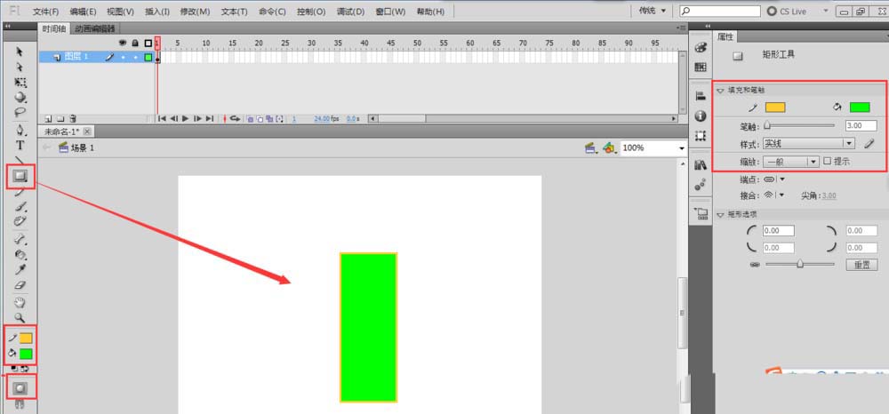 2、選擇工具欄中的矩形工具,勾選工具欄下方的對象繪制按鈕,設置筆觸顏色與填充顏色,在右側的屬性窗口中設置筆觸的大小等,然后在場景畫布區域繪制出一個矩形出來。