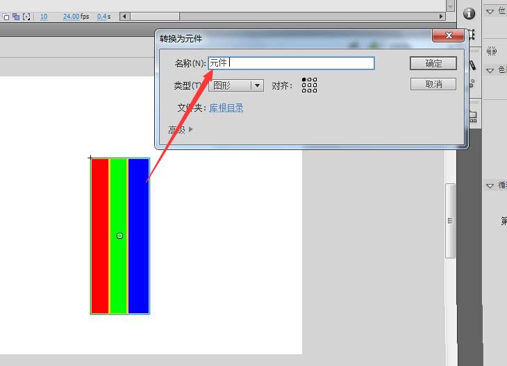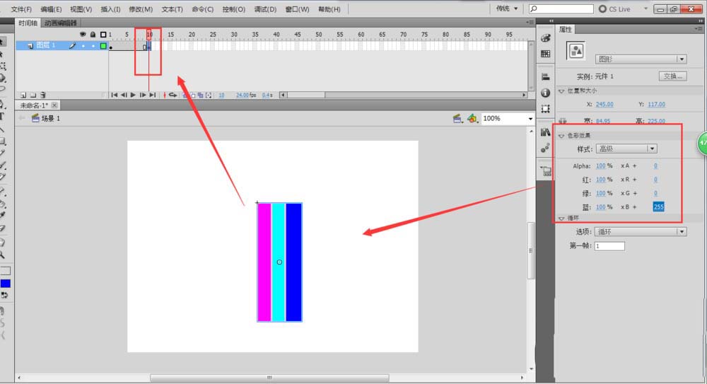 5、點擊場景返回場景畫布中,選中矩形,右鍵將其轉換為圖形元件,然后在時間軸窗口中第十幀的位置按F6插入一個關鍵幀,鼠標定位在第十幀位置,單擊矩形,打開屬性窗口,選擇屬性中色彩效果樣式中的高級,然后調整藍色的數值,一直調整到225.