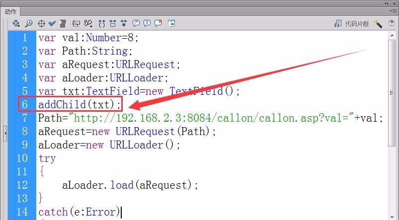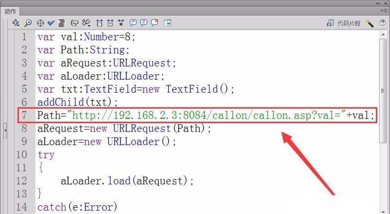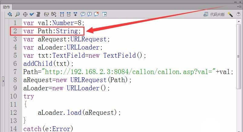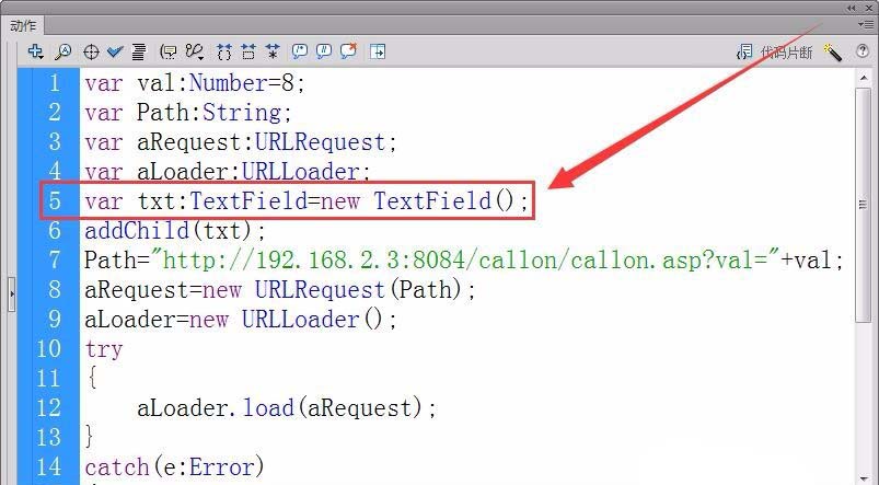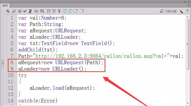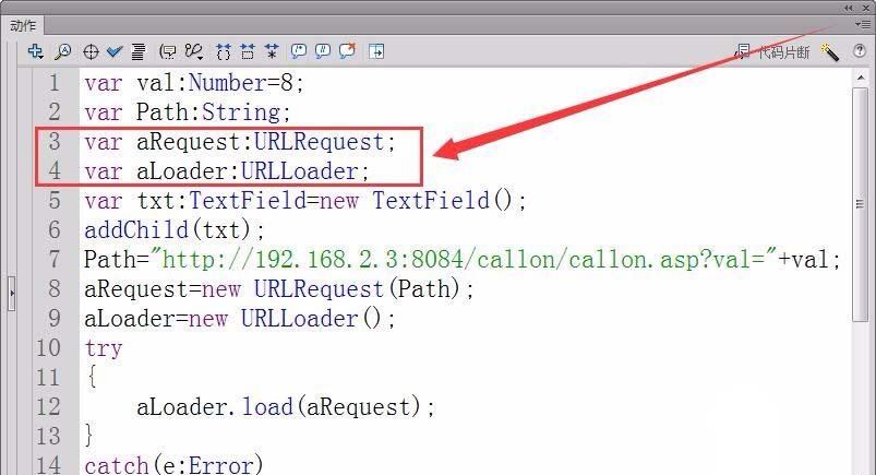 10、創建一個URLRequest和URLLoader實例,實例名為aRequest和aLoader。