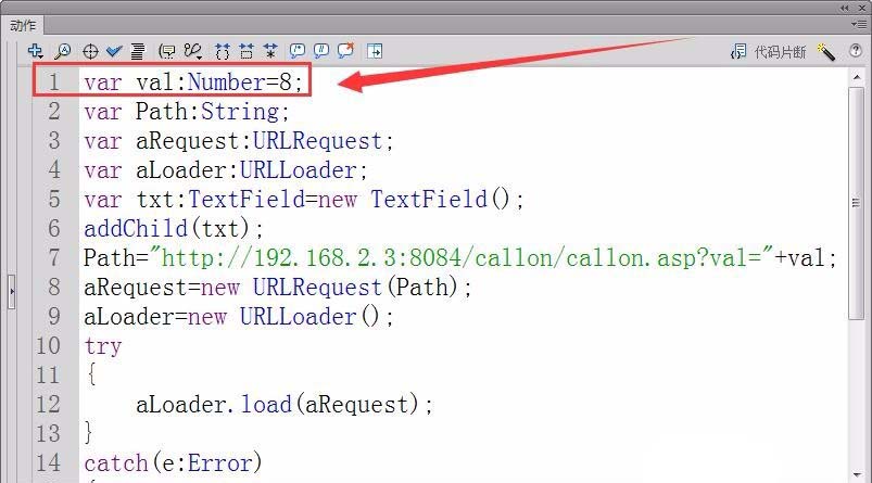 4、打開Flash文檔,在動作面板中,定義一個數值型變量val,值為8。