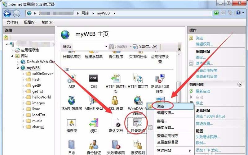1、打開IIS,在“目錄瀏覽”上右擊,打開服務器所在文件夾。