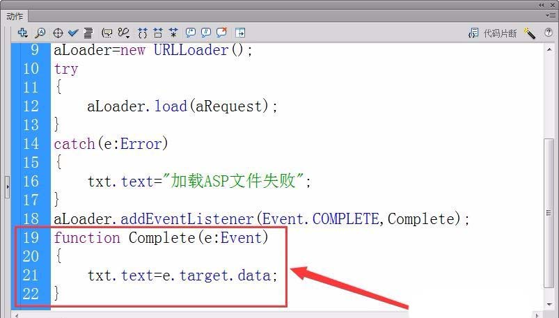 13、最后,定義偵聽器函數Complete,在舞臺輸出Flash提交數據給ASP網頁后的值。