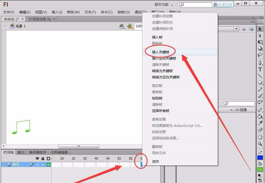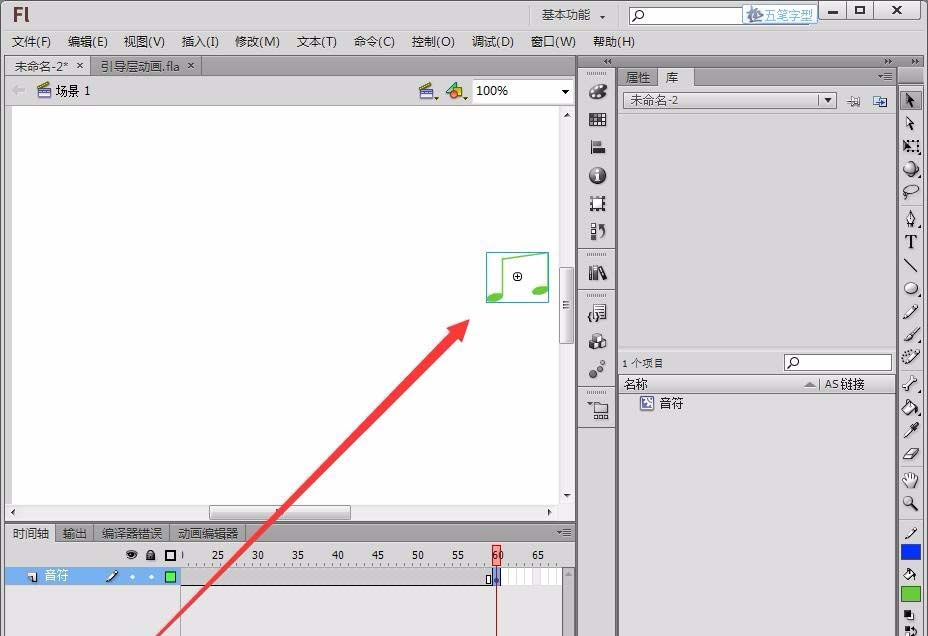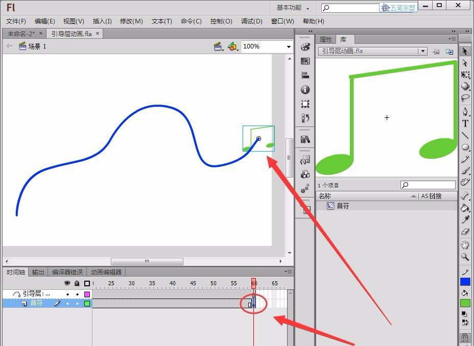 12、單擊音符圖層的第60幀,將音符拖動到曲線的末端,引導層動畫就制作好了。