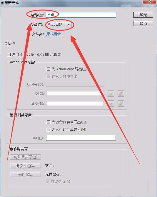 2、將元件名稱取名為音符,元件類型為影片剪輯類型。