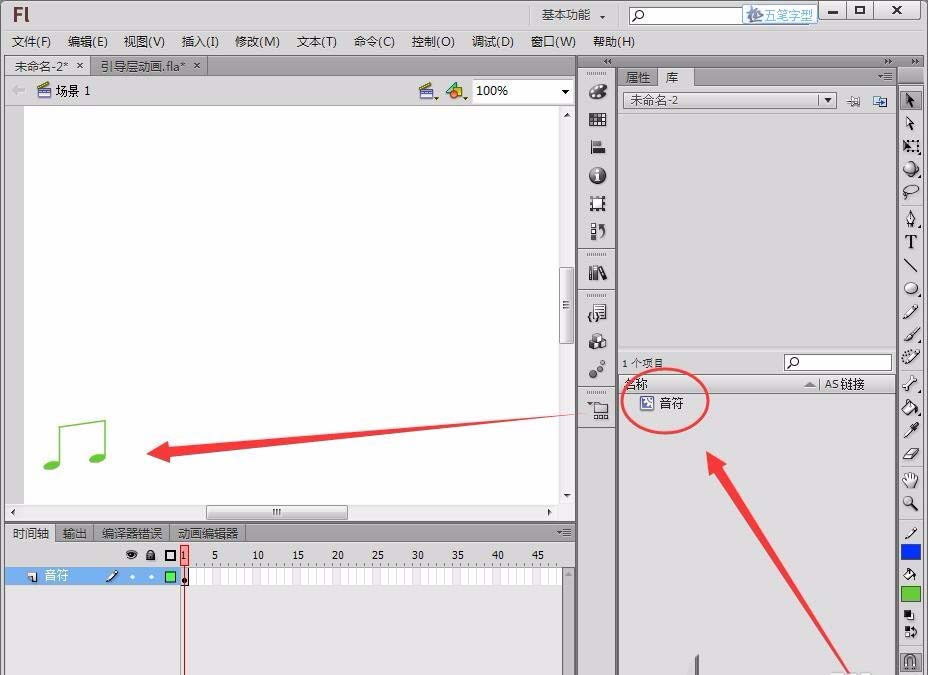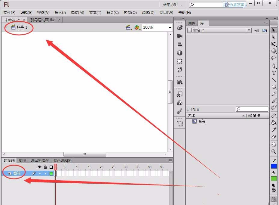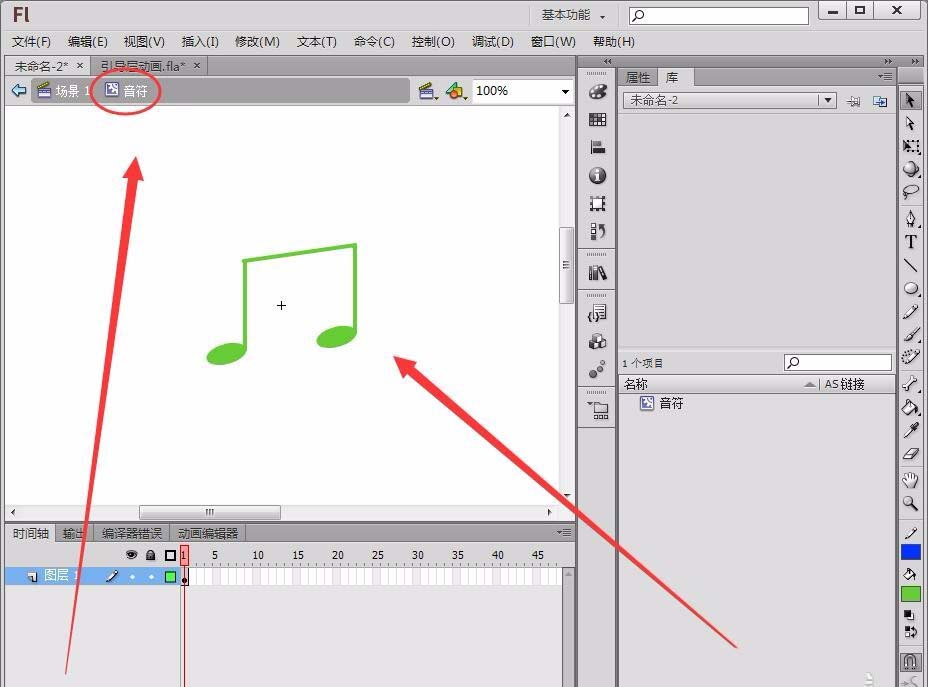 4、回到場景1,將圖層1重命名為音符。