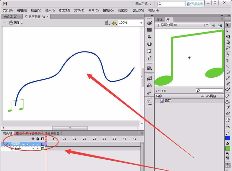 11、選擇音符圖層的第1幀,將元件拖動到曲線的起始端。