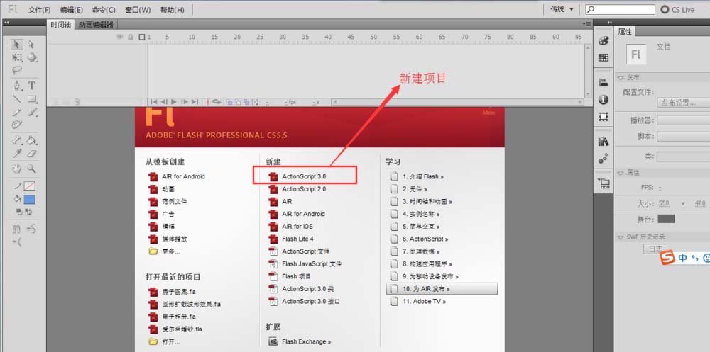 1、雙擊flash快捷圖標(biāo),打開flash軟件,新建一個(gè)flash項(xiàng)目。