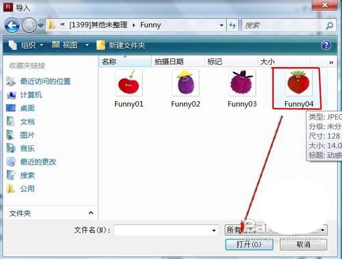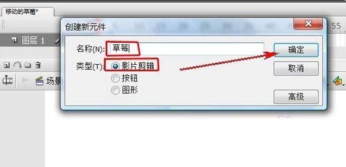 7、新建一元件,名稱為“草莓”,類型為“影片剪輯”。