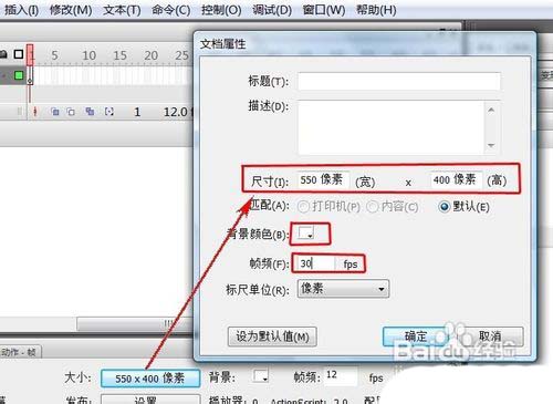 3、新建一文檔,設大小為550×400像素,背景為“白色”,幀頻為“30fps”。