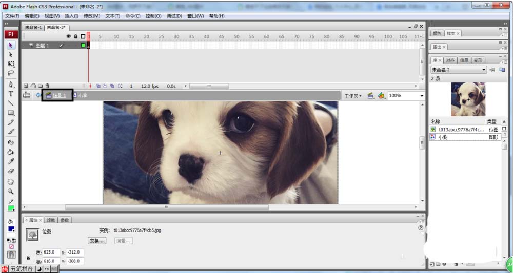 5、執(zhí)行“窗口〉庫”命令,在彈出的“庫”面板中可以看到“圖形”元件“小狗”。