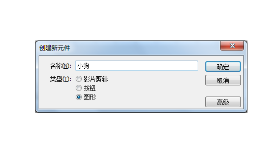 2、執(zhí)行“插入〉新建元件”命令。如圖(1)彈出“創(chuàng)建新元件”對話框,設(shè)置元件的類型為“圖形”,并命名元件“名稱”為“小狗”。單擊“確定”按鈕。
