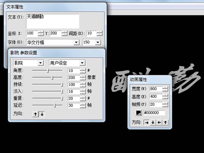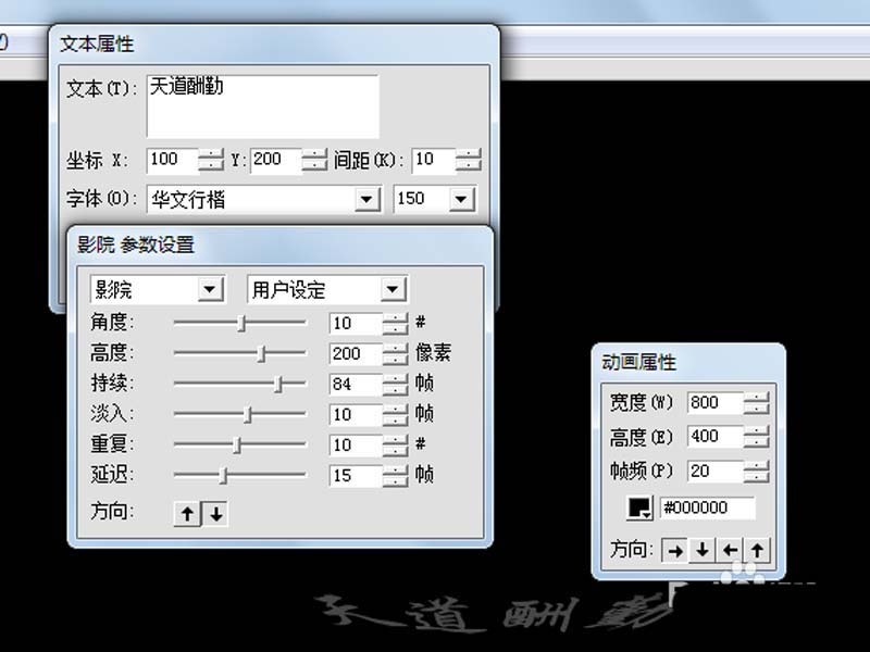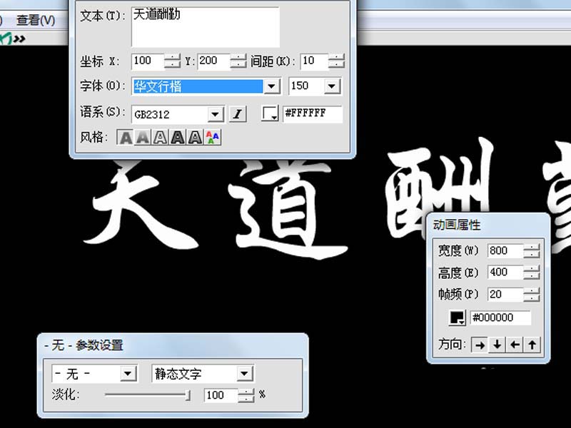2、在文本屬性對話框中輸入文字內容“天道酬勤”,字體為華文行楷,字號為150,字體顏色為白色。