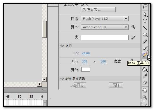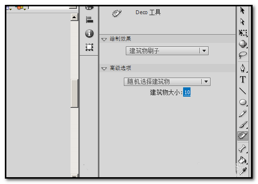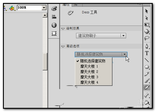2、FLASH CS6為我們提供了一個很強大的工具,Deco工具,用這個工具,我們可以刷出很多的圖案。比如,高樓大廈。
