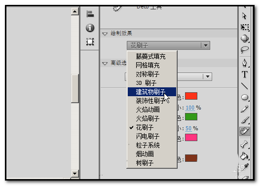 4、在下拉菜單中點:建筑物刷子,然后,再點開:高級選項,選擇其中一種建筑物