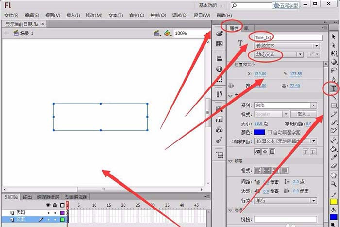1、在Flash文檔中繪制一個(gè)動(dòng)態(tài)文本框,屬性面板中,將實(shí)例名取名為Time_txt。