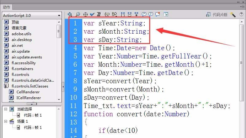 2、新建一個(gè)代碼圖層,打開動(dòng)作面板。首先,定義三個(gè)字符型變量,用來保存系統(tǒng)當(dāng)前的年、月、日。