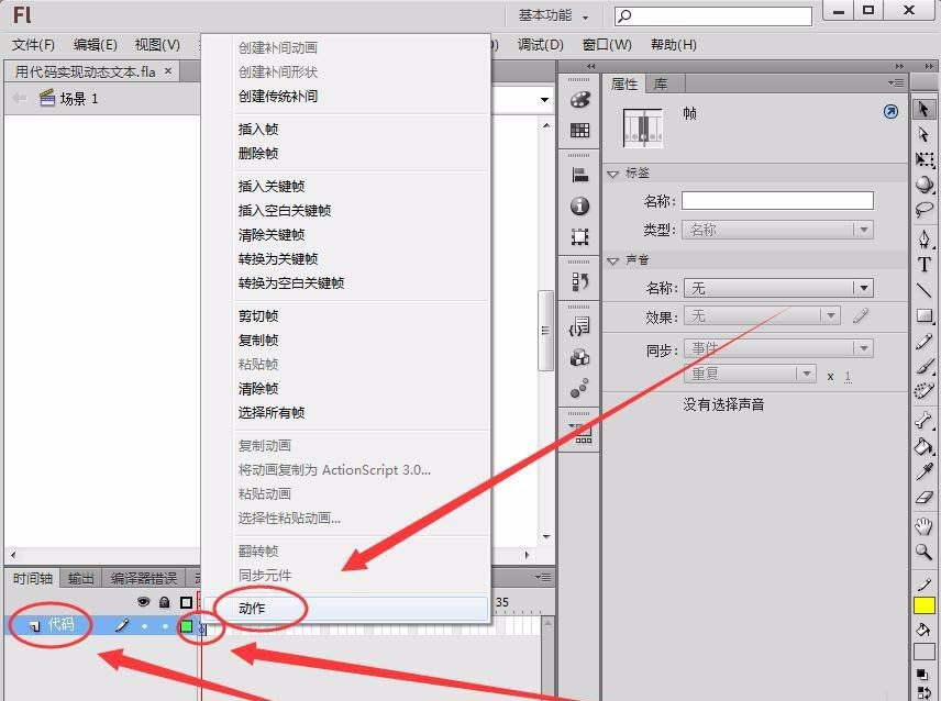 2、將圖層1重命名為代碼圖層,在第1幀上右擊,選擇“動作”選項。
