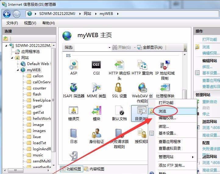 1、打開IIS管理器,在“目錄瀏覽”上右擊,選擇“瀏覽”。