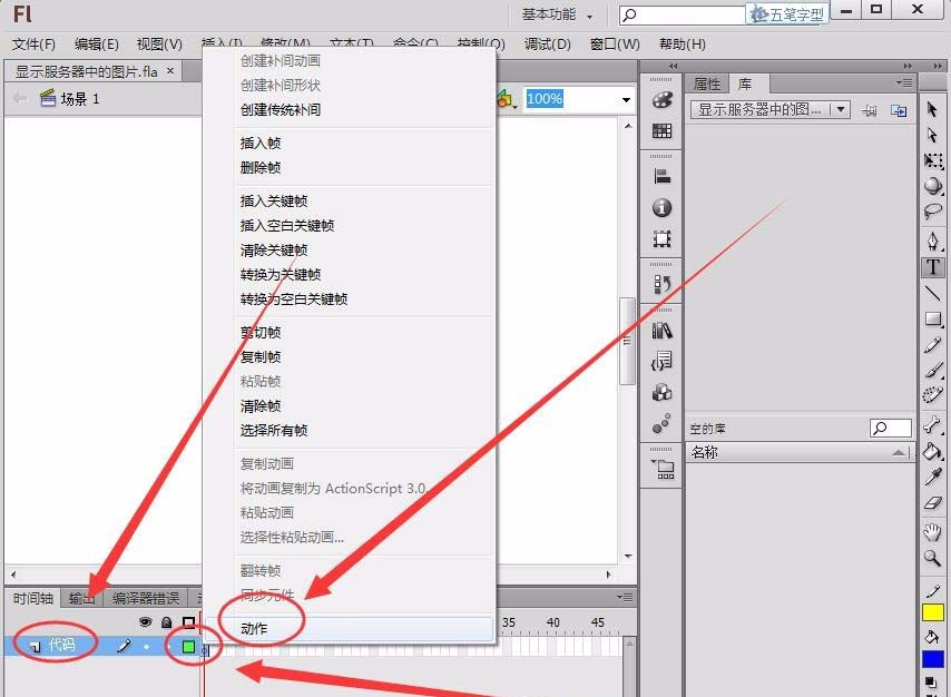3、創建一個Flash文檔,將圖層1重命名為代碼,打開動作面板。