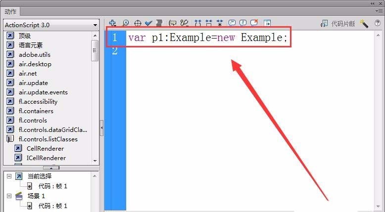 9、新建代碼圖層,打開動作面板,輸入創(chuàng)建一個Example類實例p1的代碼。