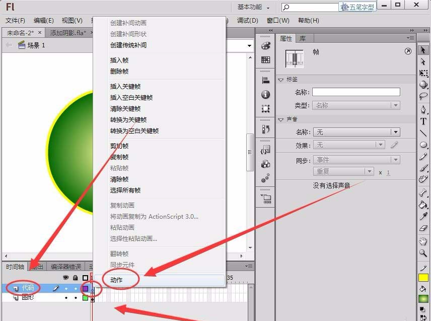 5、新建一個圖層命名為“代碼”,在圖層的第1幀右擊,選擇“動作”選項。