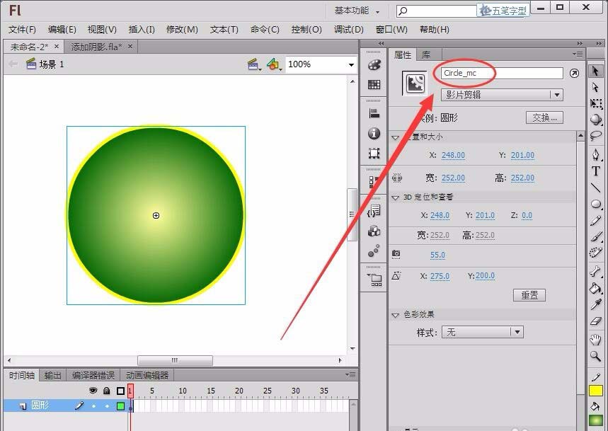 4、將圖層1重命名為圓形,把圓形影片剪輯元件拖動到舞臺的合適位置,實例名稱取名為“Circle_mc”。
