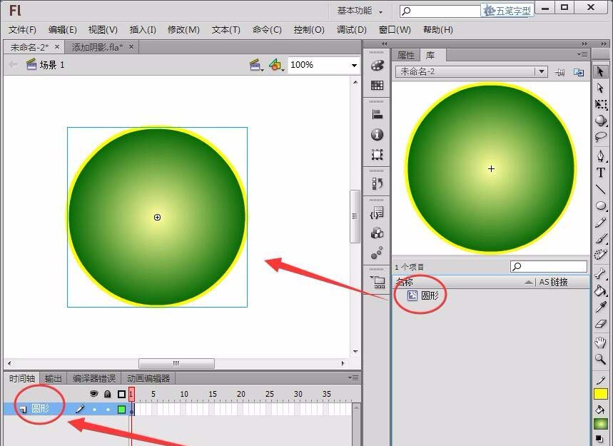 10、運行程序,在舞臺中顯示圓形圖案,圓的右下角出現一個陰影。