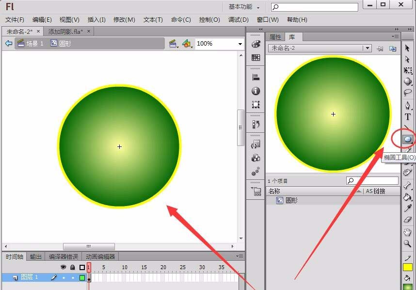 3、選擇“橢圓工具”,在元件編輯窗口中繪制一個圓形。