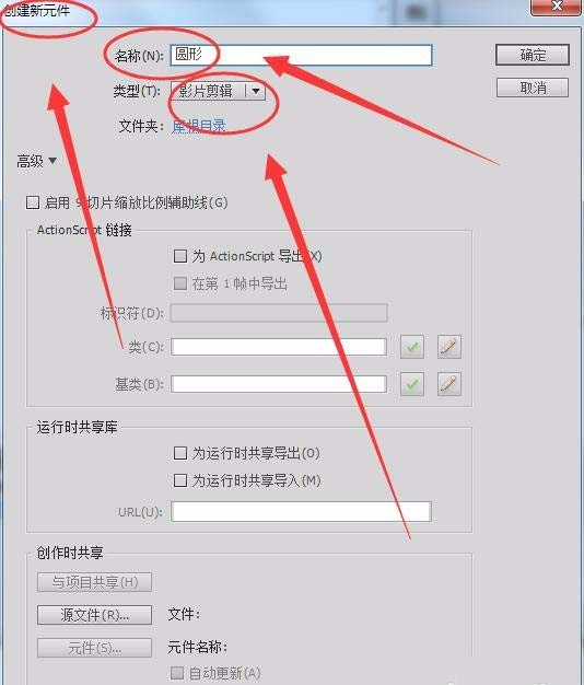 2、在創建新元件對話框中,將名稱取名為“圓形”,類型選擇“影片剪輯”,單擊“確定”。