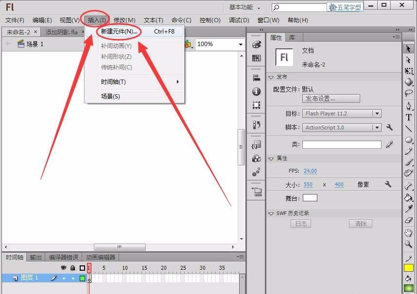 1、新建一個Flash文檔,單擊“插入”---->“新建元件”。