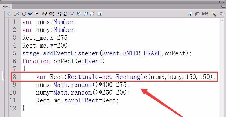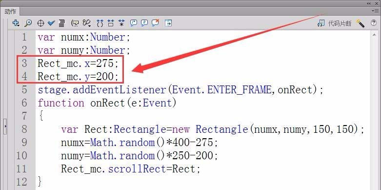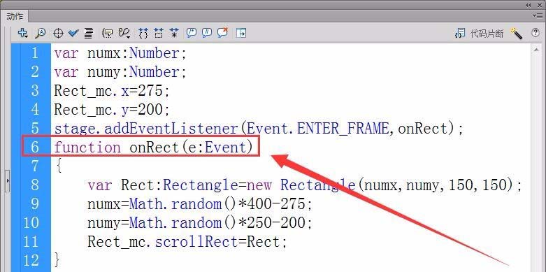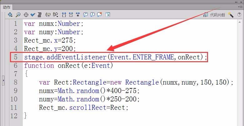 5、接著,注冊(cè)舞臺(tái)stage的enterframe事件的偵聽(tīng)器,接收者函數(shù)為onRect。