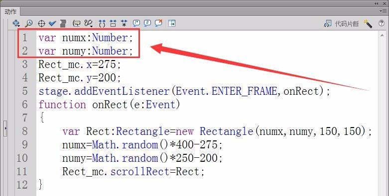 3、新建一個(gè)“代碼”圖層,打開(kāi)動(dòng)作面板。首先,定義兩個(gè)實(shí)型變量numx和numy,用來(lái)存儲(chǔ)顯示圖像區(qū)域的左上方位置坐標(biāo)。