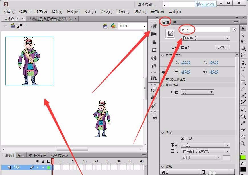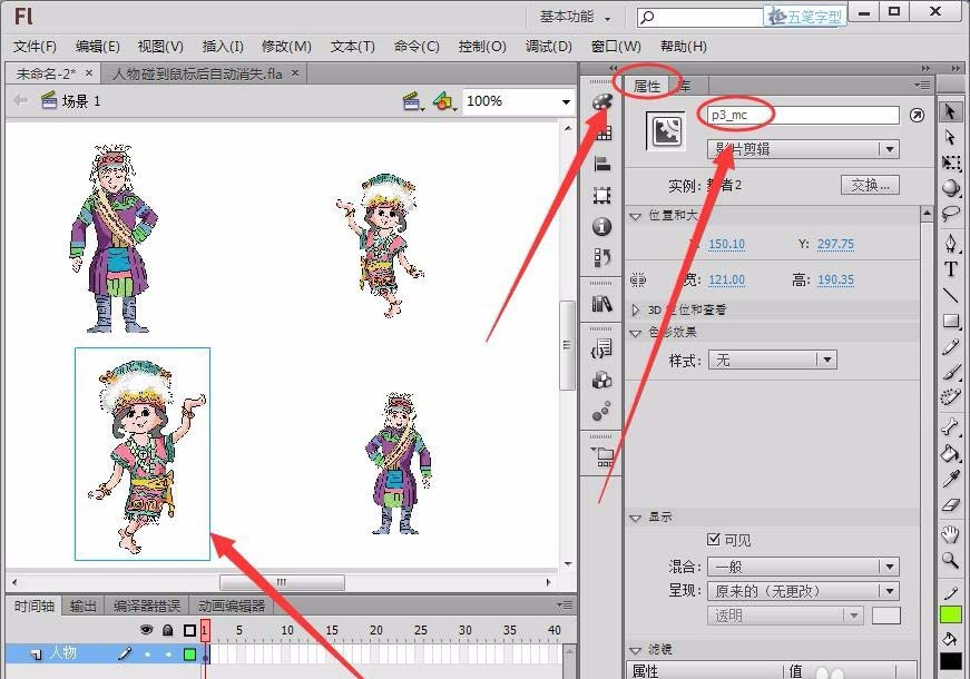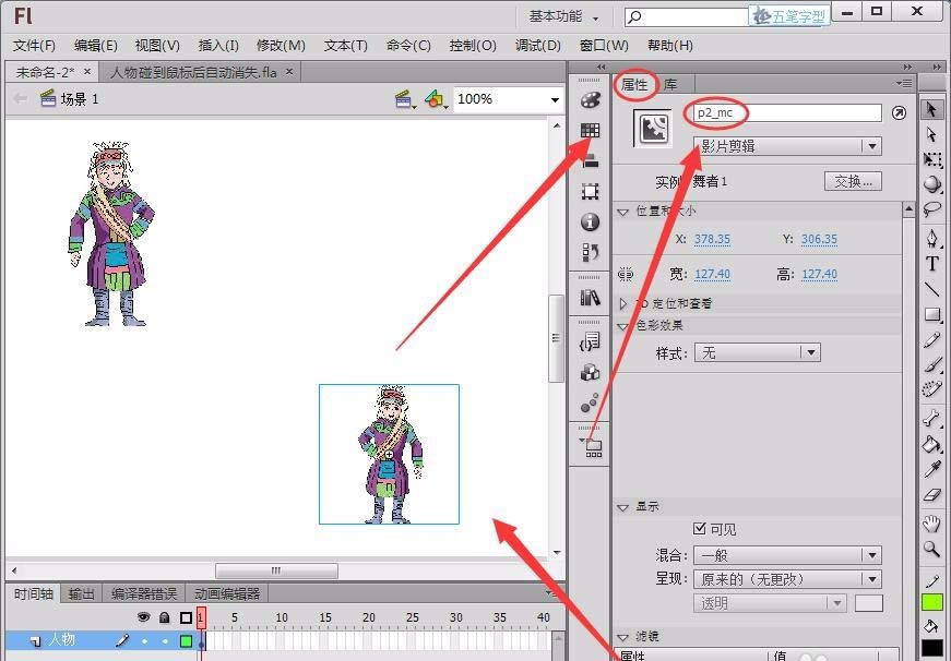 3、在舞臺拖動制作兩個舞者1,在屬性面面板中,將實例名稱取名為“p1_mc”和“p2_mc”。