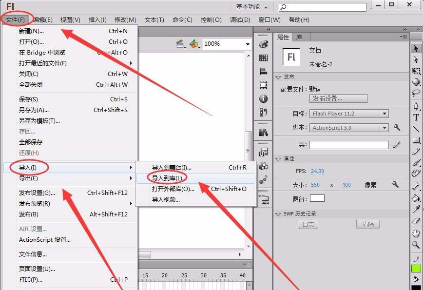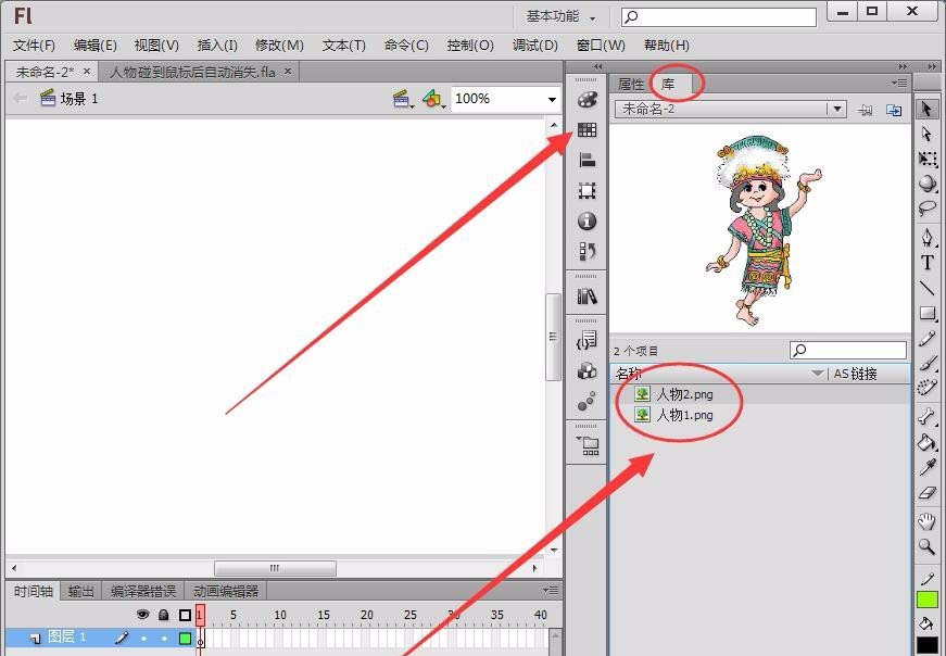 1、單擊“文件”---->“導(dǎo)入”---->“導(dǎo)入到庫”,在庫面板中插入兩張圖片“人物1”和“人物2”。