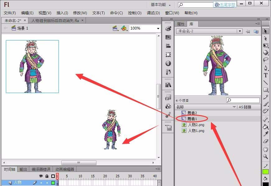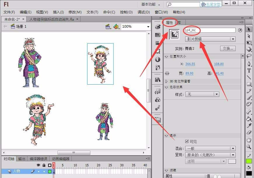 4、用上一步同樣的方法,在舞臺繪制兩個舞者2,將實例名稱取名為“p3_mc”和“p4_mc”。