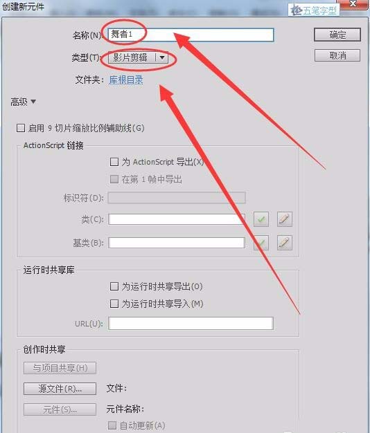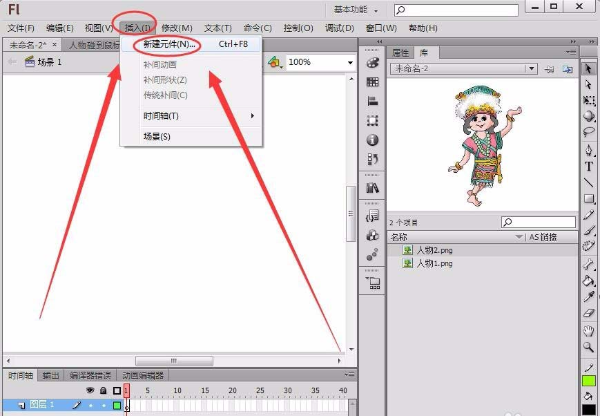 2、單擊“插入”---->“新建元件”,制作兩個影片剪輯元件舞者1和舞者2。