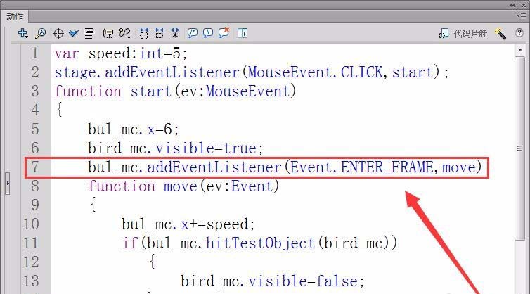 8、注冊子彈的enterframe事件的偵聽器,接收者函數控制子彈飛行擊中小鳥后的顯示。