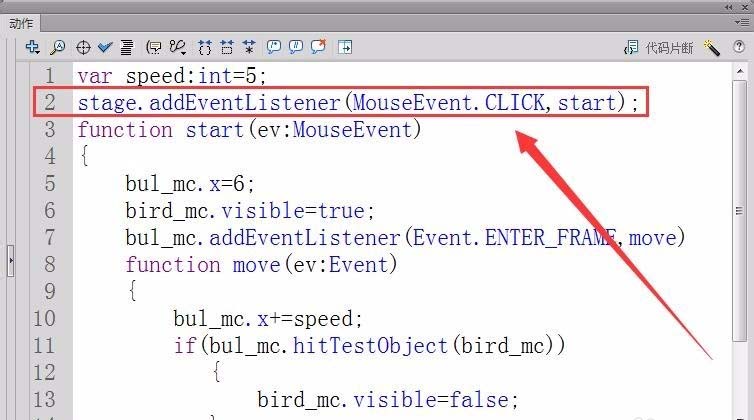 4、接著,注冊舞臺的鼠標單擊事件的偵聽器,接收者函數用于控制子彈飛出。