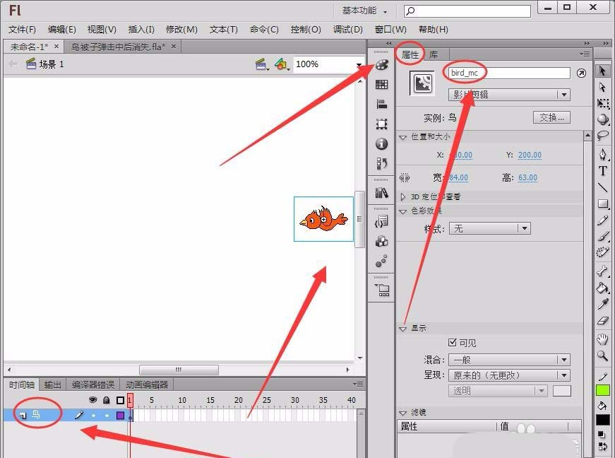 1、在舞臺繪制一個小鳥影片剪輯元件,將實例名稱取名為“bird_mc”。