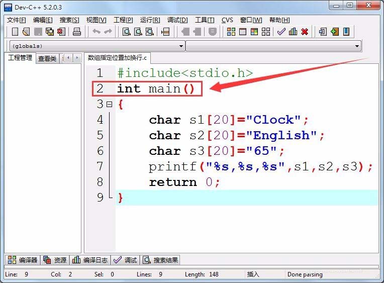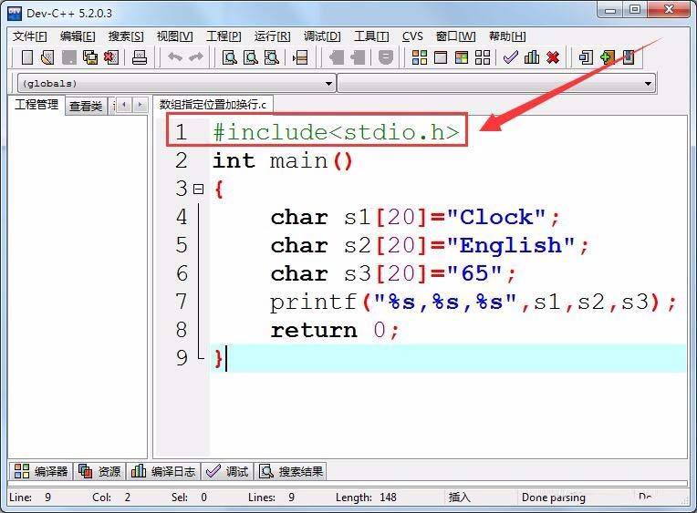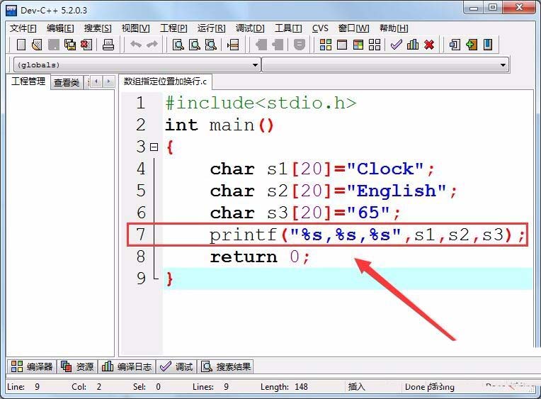 7、用printf語句,輸出三個字符串的值,如下圖所示。