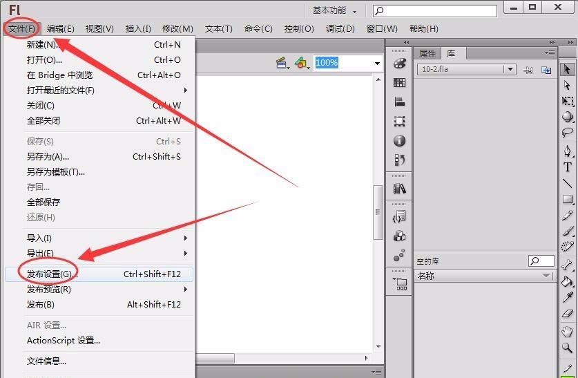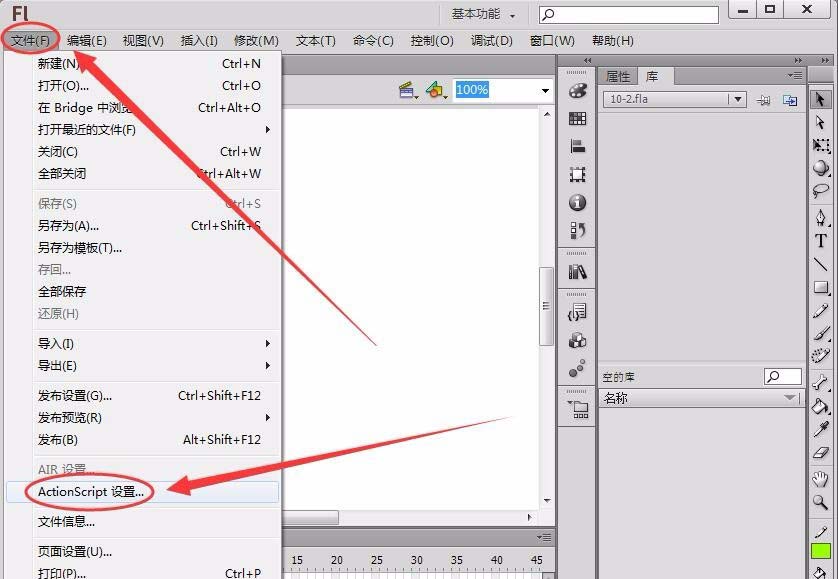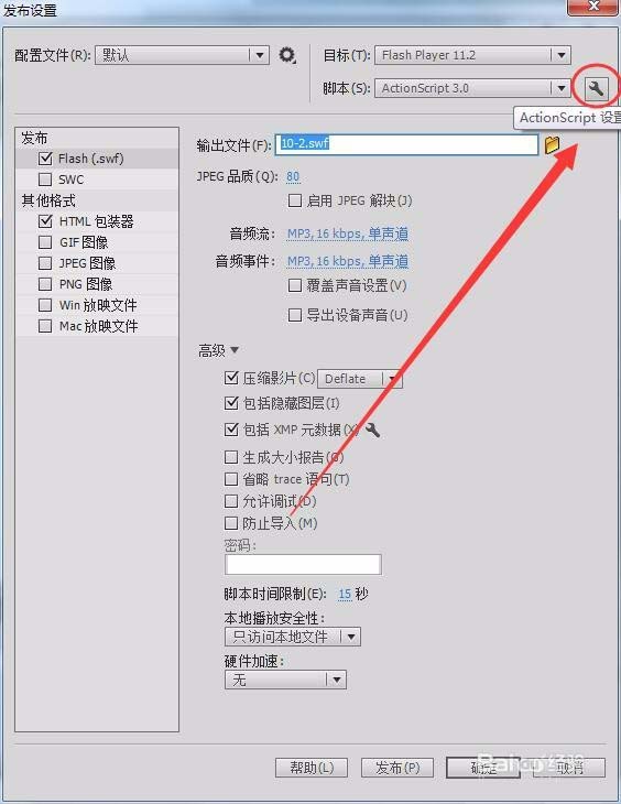 方法二:單擊“文件”---->“發布設置”,單擊“腳本”后的按鈕,打開“高級ActionScript3.0設置”窗口