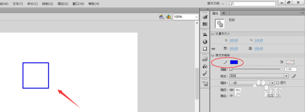 6、調(diào)整右側屬性面板,將寬、高均調(diào)整為100(根據(jù)自己需要修改)。這樣,正方形就繪制好了