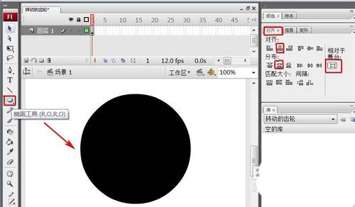 4、在“圖層1”第1幀,用“橢圓工具”畫一個無邊框,黑色的大圓,在“對齊”面板中選擇“相對于舞臺”—“水平中齊”—“垂直距中分布”
