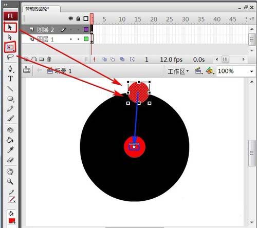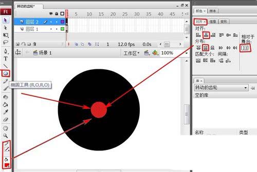 6、在“圖層2”第1幀,用“橢圓工具”畫一個無邊框,紅色的小圓,在“對齊”面板中選擇“相對于舞臺”—“水平中齊”—“垂直距中分布”