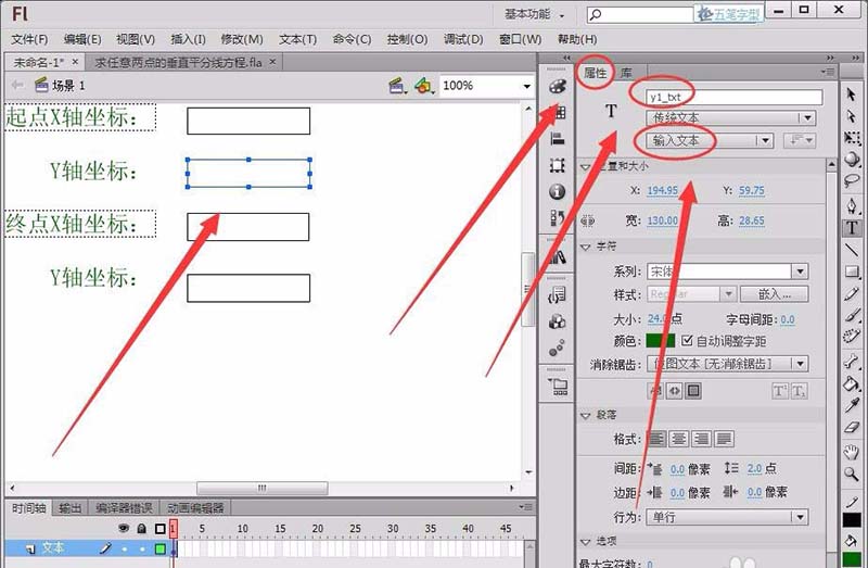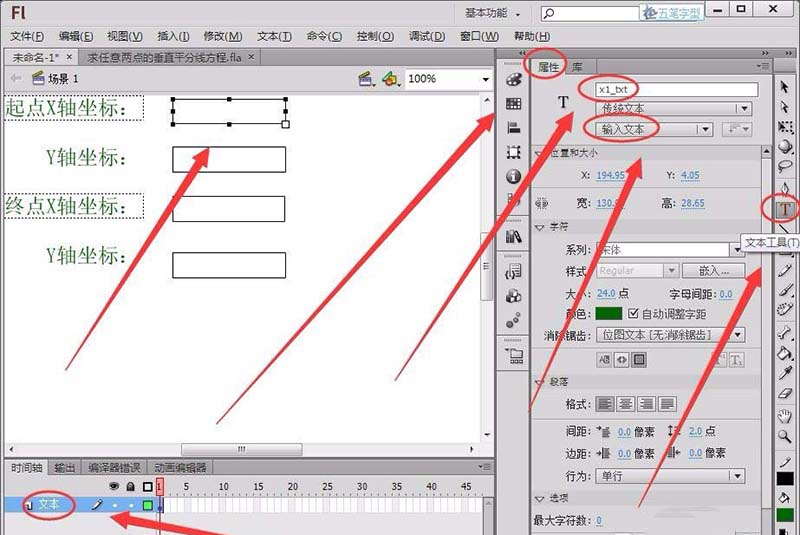 1、選擇“文本工具”,在舞臺繪制輸入起點坐標的輸入文本框,在屬性面板中,將兩個輸入文本框的“實例名稱”取名為“x1_txt”和“y1_txt”。