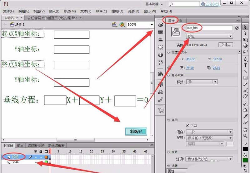 4、新建一個圖層命名為“按鈕”,插入一個“輸出”按鈕,將實例名稱取名為“out_btn”,用來控制輸出垂直平分線方程。